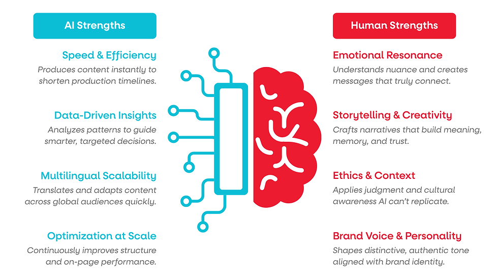 AI accelerates output. Humans elevate meaning. Together, they build content that connects faster and lasts longer.